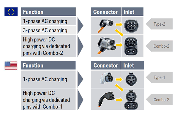 Different Regions across the globe use different charge port types. The table below shows the pin configuration for each.